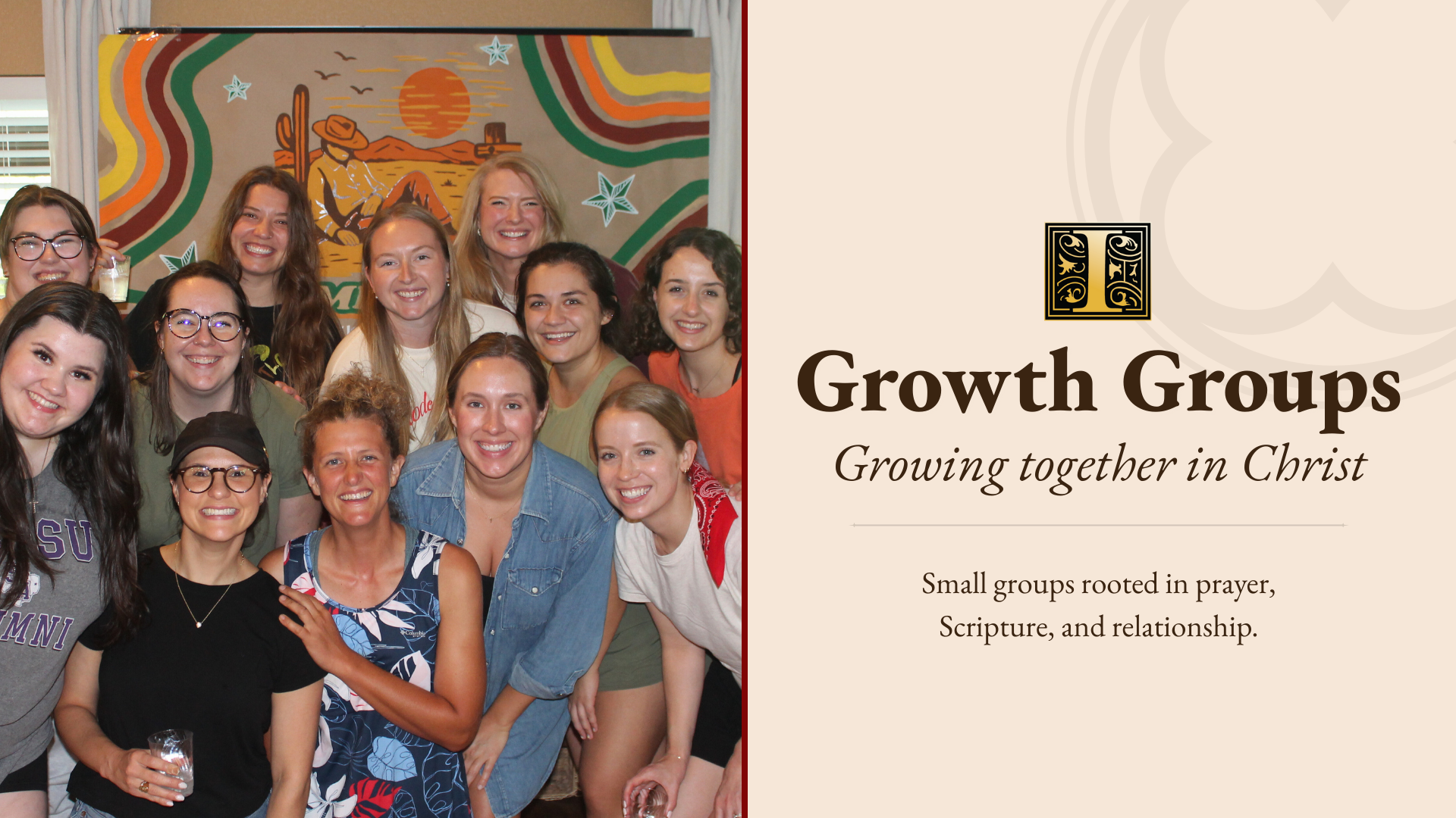 Growth Groups are Incarnation’s home-based small groups where you can connect socially and spiritually, meet people from across the church, and grow together through prayer, study, and relationships. Groups meet twice a month on weeknights (with options nearly every night of the week), and most will begin in mid-August 2025. You can note your preferred nights when you register.